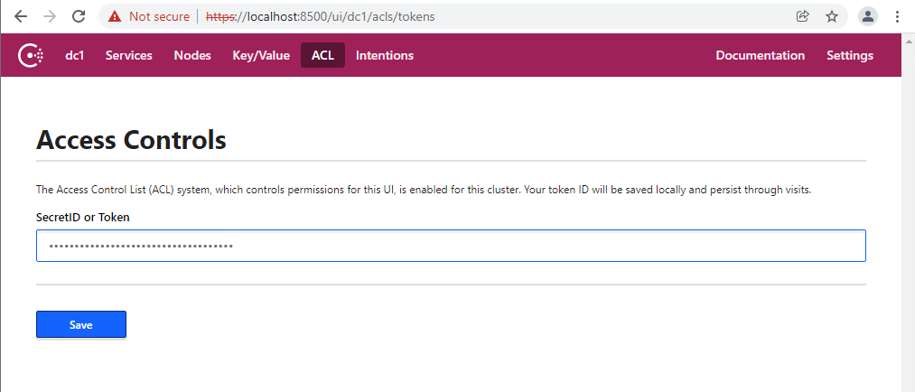 ACLtab and enter theSecretIDfrom the bootstrap result (in the example above,145d39a6-1366-7e3b-496e-fd2f2ea6ae23) (only on one server in case of a cluster): -