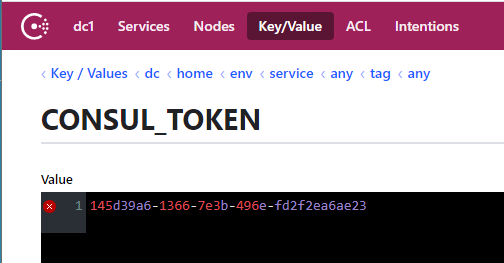 Key/Valuetab and specify theSecretIDfrom the bootstrap result (in the example above,145d39a6-1366-7e3b-496e-fd2f2ea6ae23) at thedc/home/env/service/any/tag/any/CONSUL_TOKENkey (only on one server in case of a cluster): -