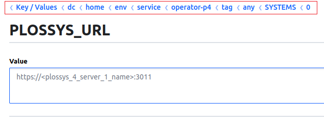 The PLOSSYS_URL for the first system in Consul UI. Take notice of the emphasized breadcrumb line on top: