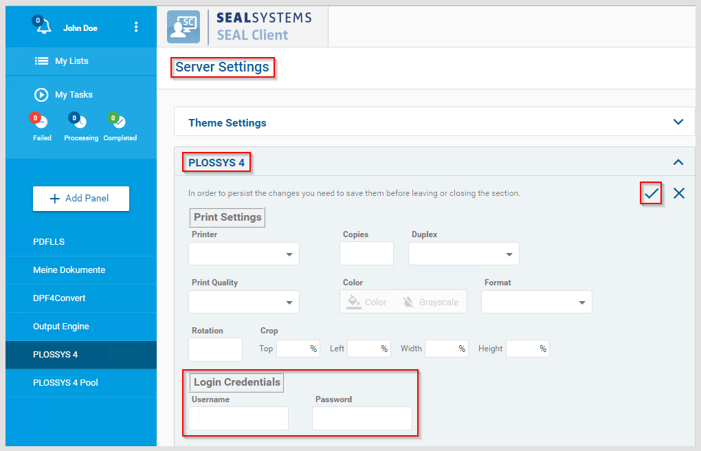 3. In the PLOSSYS 4 section of the server settings, change to edit mode, specify user name and password and save the settings.